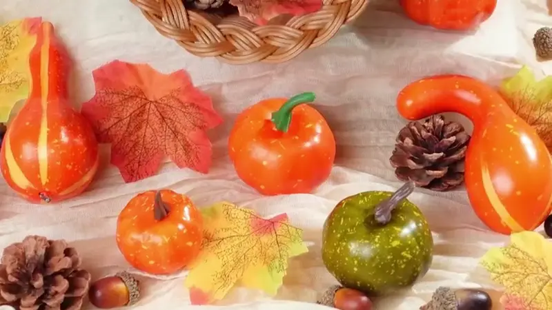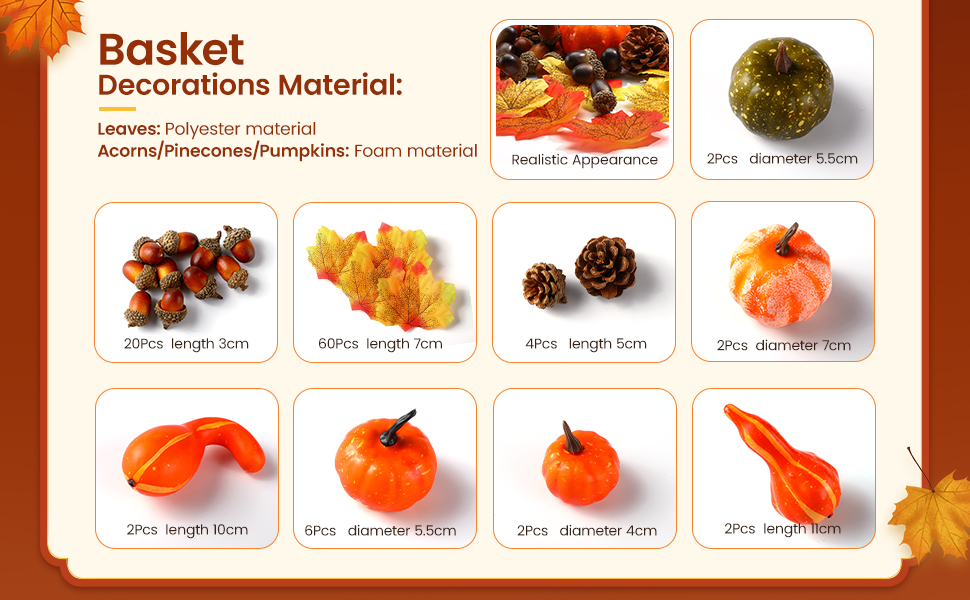 Enduring and Quality Material: our cornucopia basket and decorations are designed to impress; The basket is made of imitation rattan, boasting durability and beauty simultaneously; This set includes 60 leaves made from polyester for authenticity, 20 foam acorns, 4 foam pinecones, and 16 artificial foam pumpkins; These thanksgiving cornucopia decorations are designed to stand the test of time, and they add a rustic charm to any setting