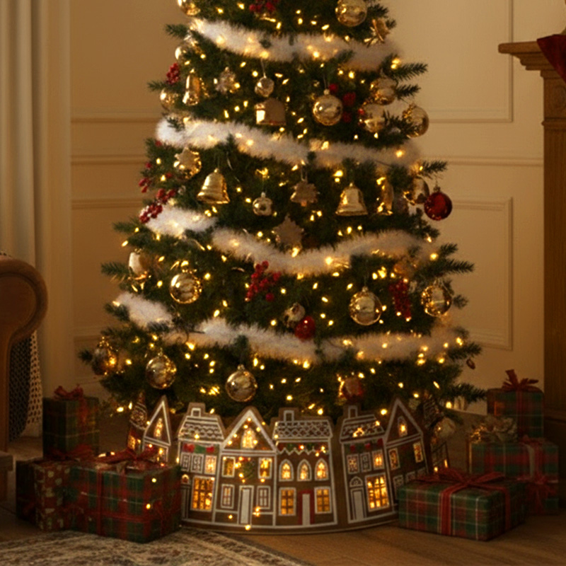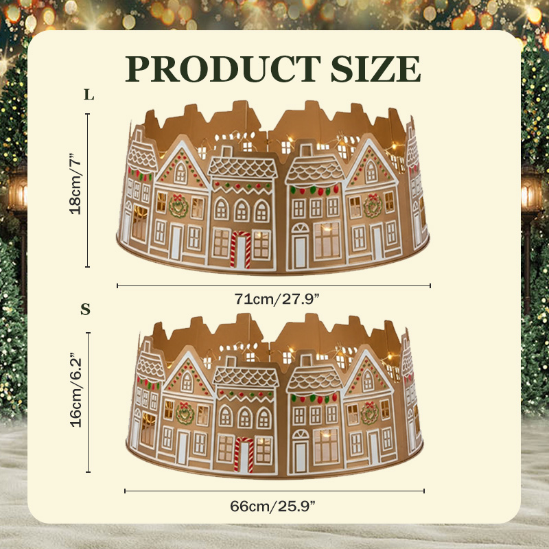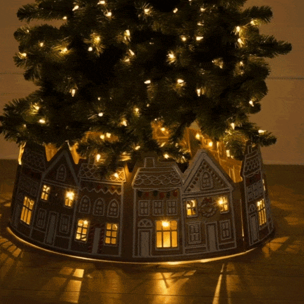 Equipped with a built-in button battery light string, this Christmas tree collar adds a warm glow to your tree.