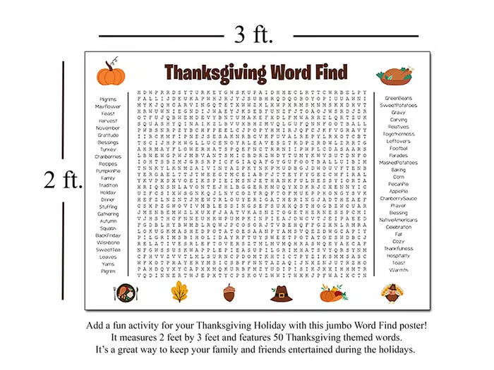 Bring the whole family together this holiday season with our larger-than-life Thanksgiving Word Search Poster! Perfect for decorating your space and keeping guests entertained, this jumbo wall game turns any gathering into a fun, interactive experience.